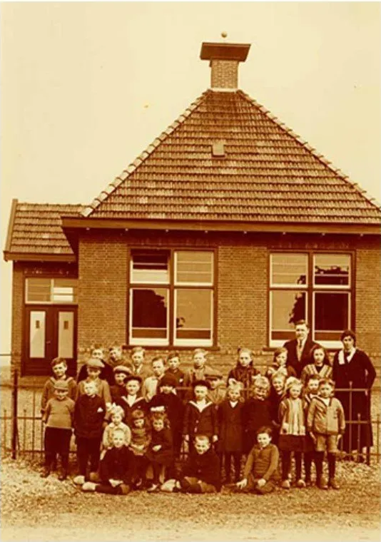 'Onze school lag met een klein speelplein ertussen bij de kerk. Op de natuurstenen stoep van de kerk slepen we de griffels. Ja, griffels en leien, die waren nog ín, compleet met sponzendoos en griffelkoker’. Het schoolgebouw zelf was ‘beneden alle kritiek: oud, koud en tochtig en de hygiëne bij de pomp en de toiletten was beneden alle peil.’ Maar ‘je went als kind als gauw. Je past je aan en doet alles wel thuis, wat je daar niet goed vindt’.